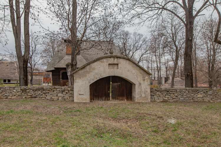 Intrarea în arcadă; porţi din lemn sub arcadă cu feronerie manuală; partea superioară din lespezi de piatră în cornişe constituie acoperişul