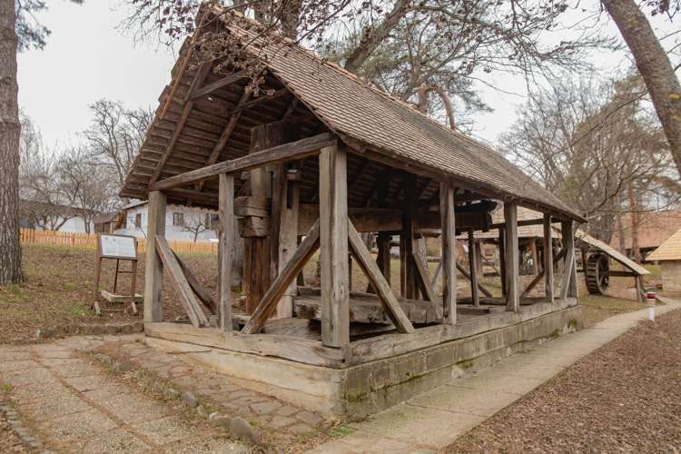 Instalaţie incompletă: lipseşte parte de lemn (pop) care să preseze strugurii şi coşul din nuiele împletite