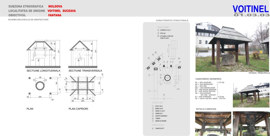 TIP: -Fântână cu tambur; DESCRIERE: -Tamburul se roteşte cu ajutorul unei mainivele din lemn fiind suspendat cu 2 braţe din lemn, de structura acoperişului.