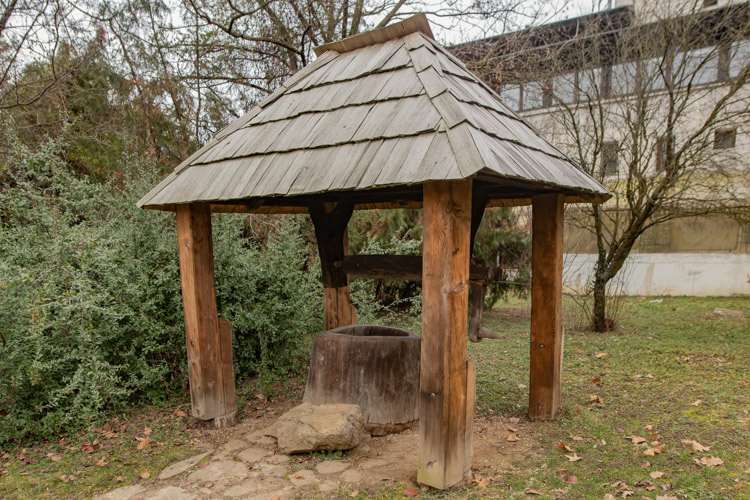 Fântână cu tambur, manivelă şi lanţ; lemn de brad; acoperiş în patru ape; învelitoare din draniţă dreaptă de brad