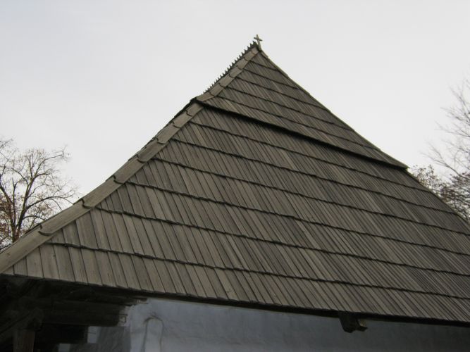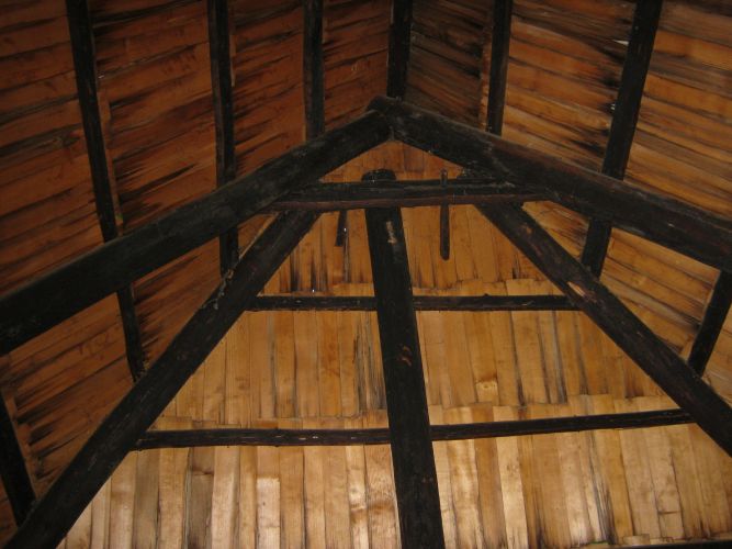 MATERIAL: -lemn de brad; TEHNICA: -laţi fixaţi deasupra căpriorilor; IMBINARE: blockbau (cununi de bârne orizontale)