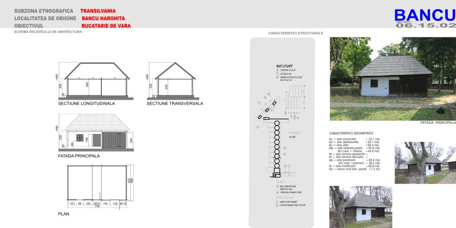 MATERIAL: -bârne de brad; leţuri de brad; TEHNICA: -tăiat; cioplit; lipit; văruit; bătut în cuie; IMBINARE: -blockbau (cununi de bârne orizontale)