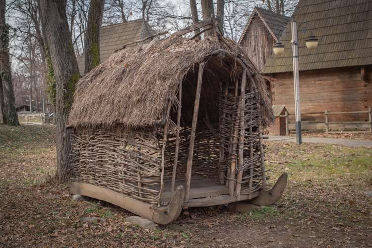 Construcţie monocelulaară pe tălpi de sanie şi proţap; lemn de stejar; nuiele groase de alun; nuiele de salcie roşie; acoperiş în două ape; învelitoare din snopi de paie de grâu