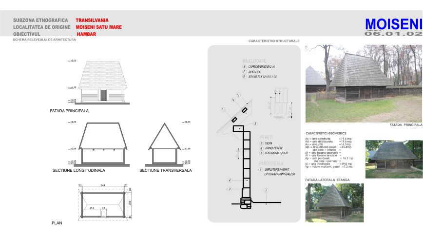 MATERIAL: -bârne de stejar; TEHNICA: -cioplire în patru feţe; IMBINARE: -blockbau (cununi orizontale)