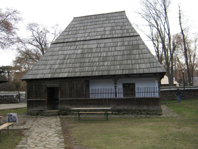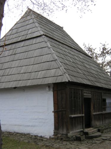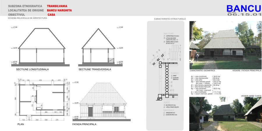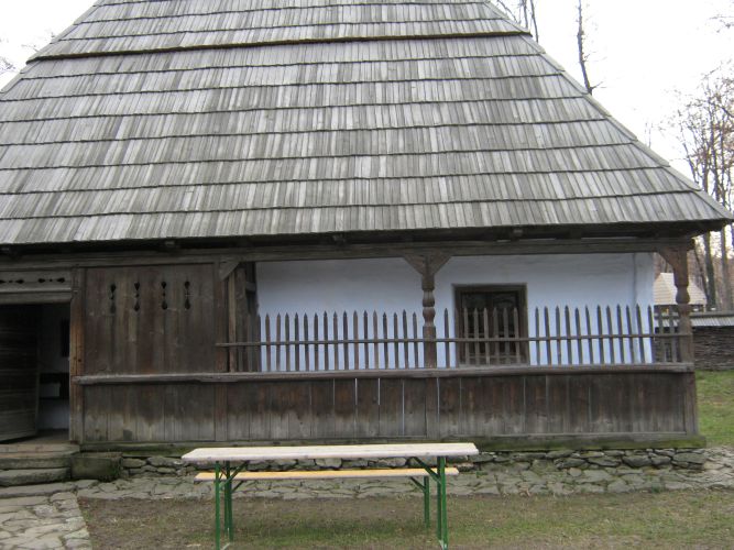 prispă ("tornaz") parțială la fațada principală, cu acces lateral din exterior și din tindă; tinda ("eres") cu dublu acces în două camere - una pentru locuit, cealaltă pentru oaspeți și cămara. Un singur nivel; din tindă se face accesul, pe scări mobile, la pivnița îngropată, parțială, aflată sub casă și la podul foarte încăpător. Spațiul prispei, mărginit de parapet de scânduri și ștacheți cu vârf ascuțit, cu doi stâlpi, tinda alăturată prispei, cu peretele aparent de lemn, în contrast cu peretele tencuit și văruit al casei. 2 axe de fațadă marcate de ușa de intrare în tindă și fereastra camerei de oaspeți. Fațadele laterale, tencuite și văruite, prezintă un gol al ferestrei la camera din dreapta, iar fațada stânga este oarbă. Fațada posterioară are două goluri de ferestre , pentru cămară și camera de locuit. Capetele de bârne, la colțuri sunt vizibile sub lipitura cu lut și văruială. Pereții sunt construiți din bârne de secțiune dreptunghiulară, încheiate în crestături în unghi drept. Bârnele au fost acoperite cu un mortar de lut, peste care s-a văruit. Peretele despărțitor între camere, în dreptul vetrelor, s-a construit din piatră. Golurile de uși, ca și cele de ferestre, s-au realizat din tocuri și praguri încastrate între bârnele pereților. Ferestrele au două foi de geam cu câte trei ochiuri fiecare. Acoperișul: deasupra ultimului rând de bârne se așează grinzile cosoroabe, pe care sprijină căpriorii. Acestea sunt realizate din trunchiuri de brad, fasonate pe patru laturi. Învelitoarea s-a făcut din draniță. Linia coamei este marcată de capetele dranițelor, care o depășesc. La capetele coamei s-au așezat două cruci mici de lemn, ca și la șură și poartă. Prispa: Balustrada prispei a fost construită până la ușa de intrare în casă, incluzând astfel și peretele din scândură al tindei. Balustrada este făcută din scânduri așezate în rame de talpă și mână curentă. Tot în bârna pentru mâna curentă sunt înfipți ștacheții, uniți printr-un leaț, ce continuă parapetul. Stâlpii ciopliți pe patru fețe sunt fixați în talpa și în grinda cosoroabă comună pentru prispă și tindă, prin contrafișe și cuie de lemn. Portița de acces din exteriorul casei este formată dintr-un parapet de scândură, unite printr-o chingă în diagonală și are deasupra, ca și parapetul pe lungimea prispei, ștacheți ascuțiți. Finisaje: pereții exteriori și interiori sunt tencuiți și văruiți, cu excepția pereților exterior și interiori ai tindei. Tavanele: grinzi și scânduri de brad, așezate una lângă alta și cu stacheți la îmbinare.